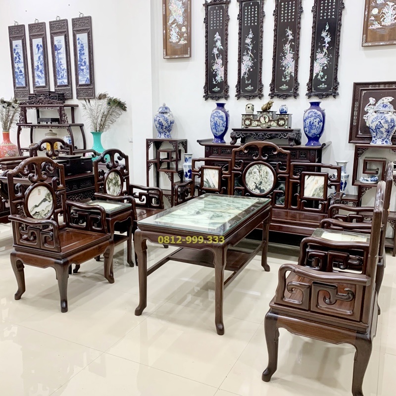 Gỗ gụ là chất liệu hàng đầu cho bàn ghế phòng khách truyền thống Việt Nam.
