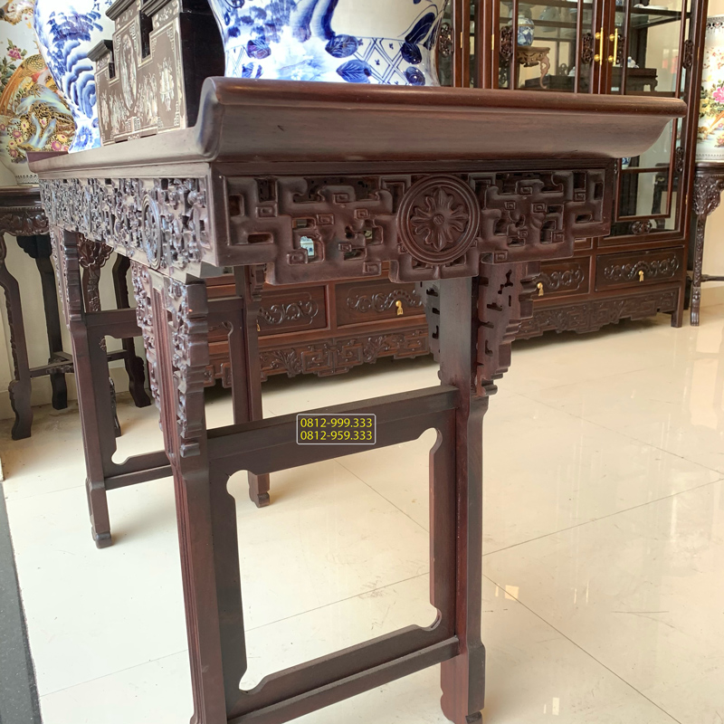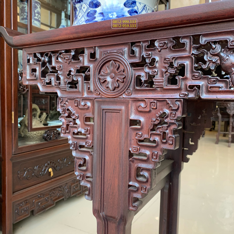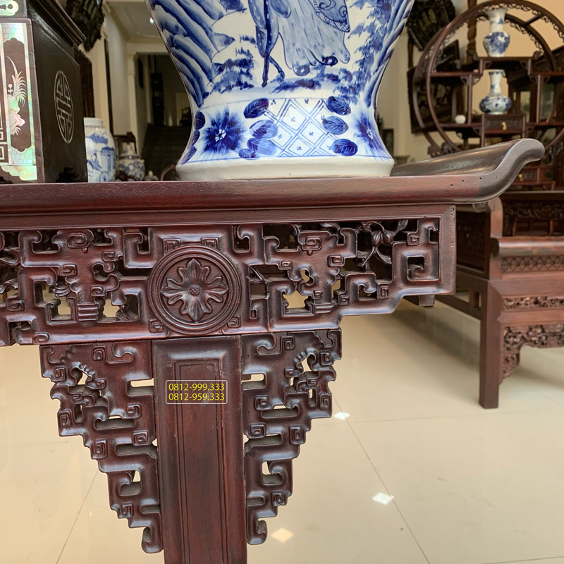 Bàn Trung Đường Triện Xúc được chạm trổ tứ diện với các nét truyện lõm đều , uyển chuyển và được làm trên nền gỗ gụ mật mang đến không gian sang trọng.