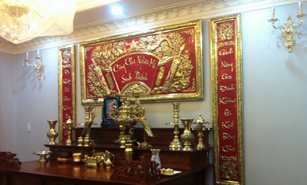 - Còn hai câu đối phải được treo cân xứng hai bên bàn thờ và không được phép treo cao hơn câu hoành phi bên trên. Nên treo cố định bằng cách ốp thẳng vào tường hoặc cột nhà để tạo nên cảm giác chắc chắn, bền vững cho tổng thể, cũng như đối với vận mệnh, sự nghiệp của gia đình.