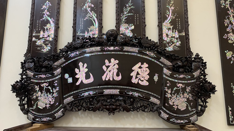 Đây là một bức tranh khảm theo mẫu cuốn thư phượng hoàng tha thư, khảm 3 chữ Đức – Lưu – Quang bằng ốc đỏ. Đây được coi là mẫu tranh khảm đem lại giá trị lịch sử cao thường được để trong phòng thờ gia tiên.