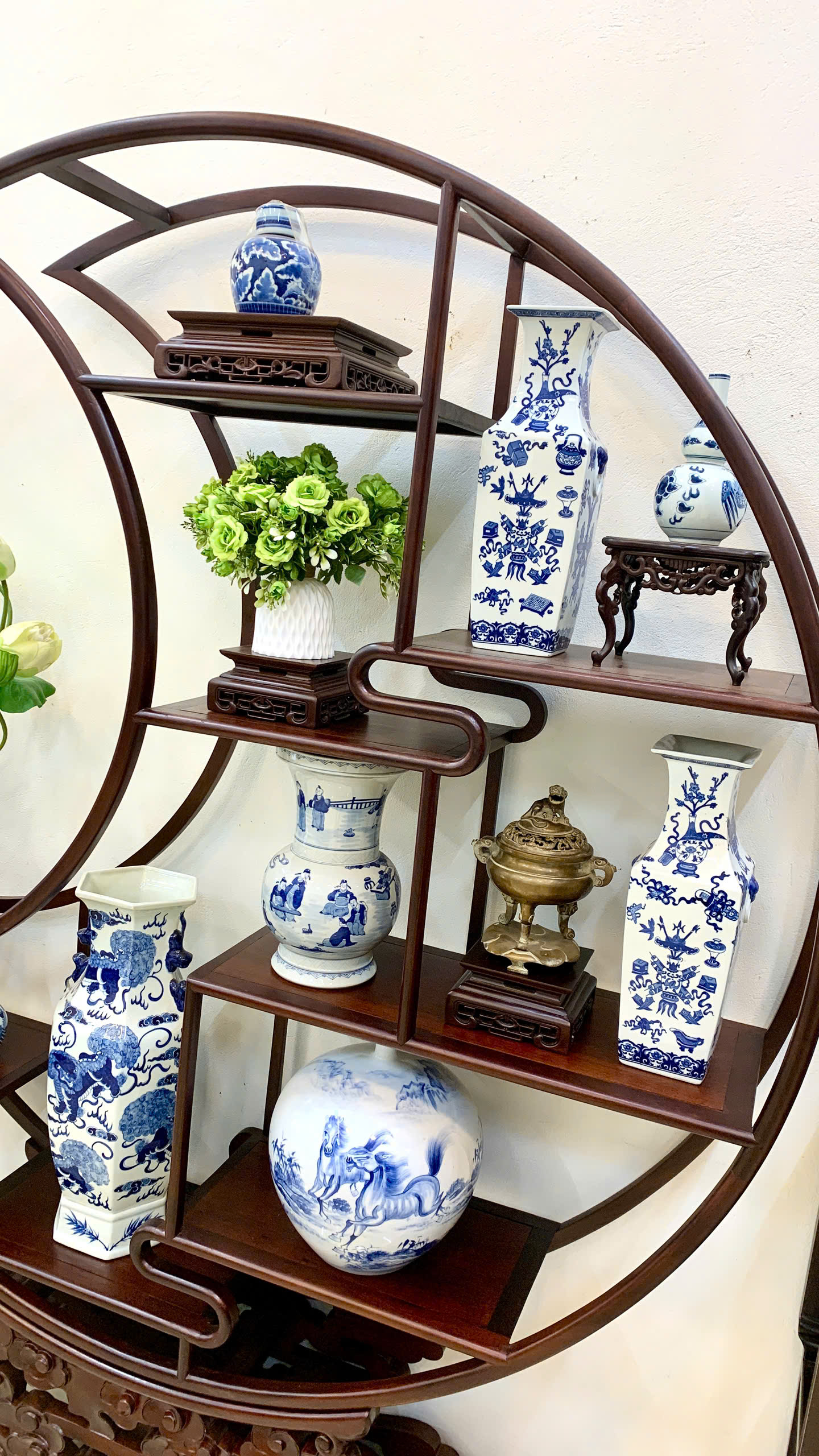 Phần các ngăn kệ được bố trí hợp lý, giúp trưng bày tượng gỗ, ấm chén, sách, lọ hoa, hay các vật phẩm phong thủy một cách tinh tế, hài hòa.