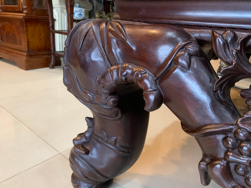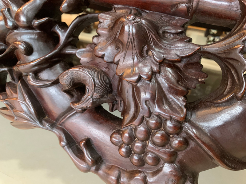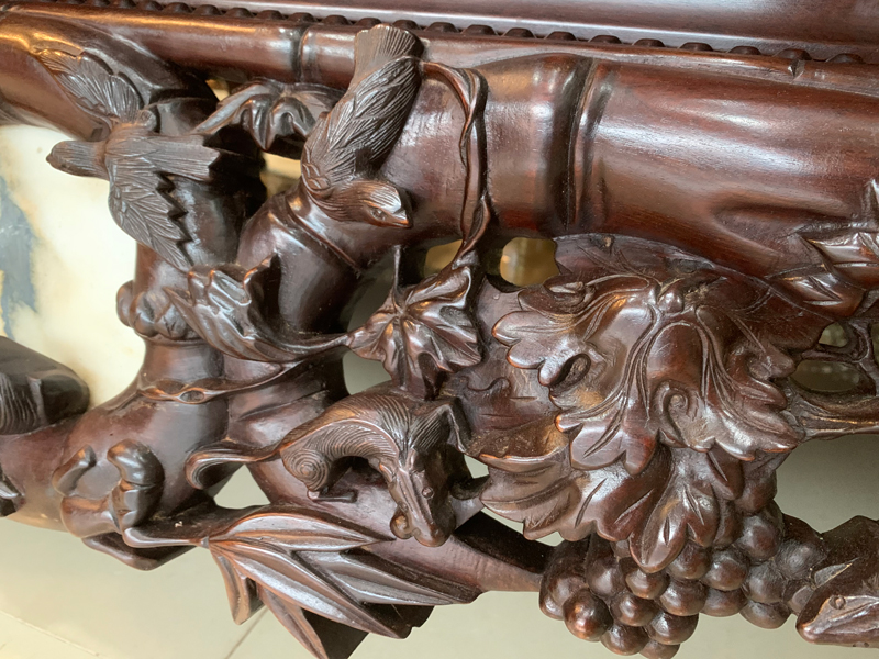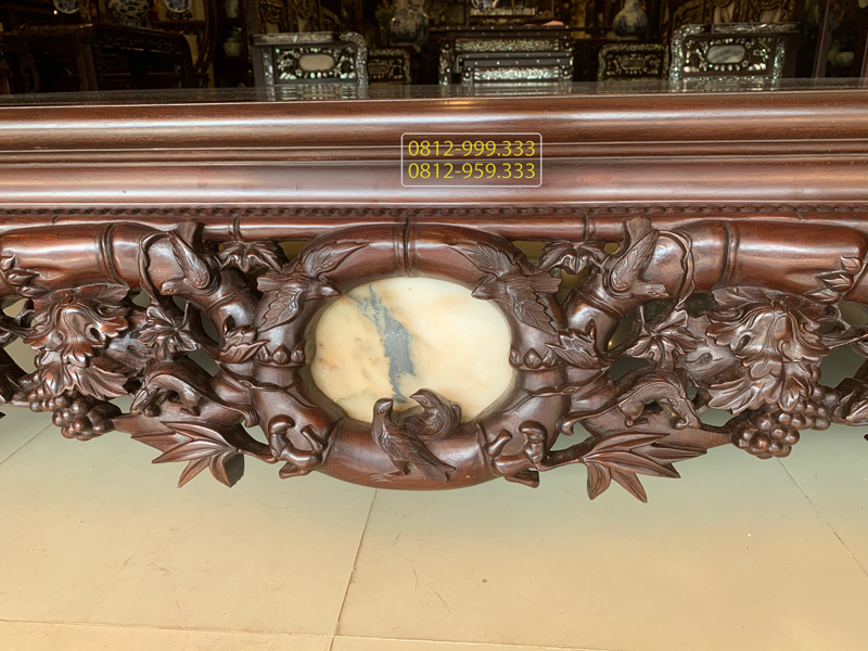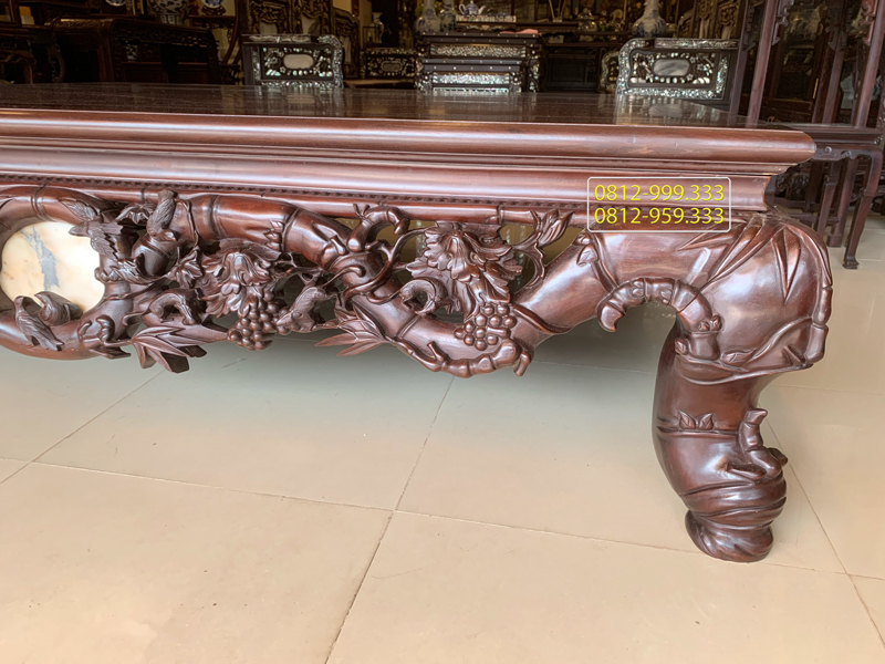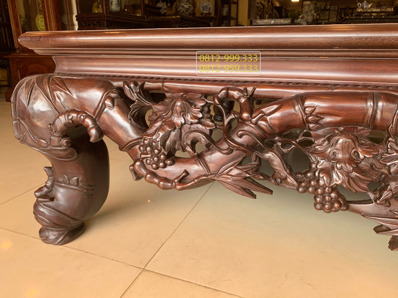 - Các thân cây trúc được đục tỉ mỉ đến từng mắt trúc, được đan xen với giàn nho sum xuê tạo hình ảnh sự sum vầy vui vẻ.