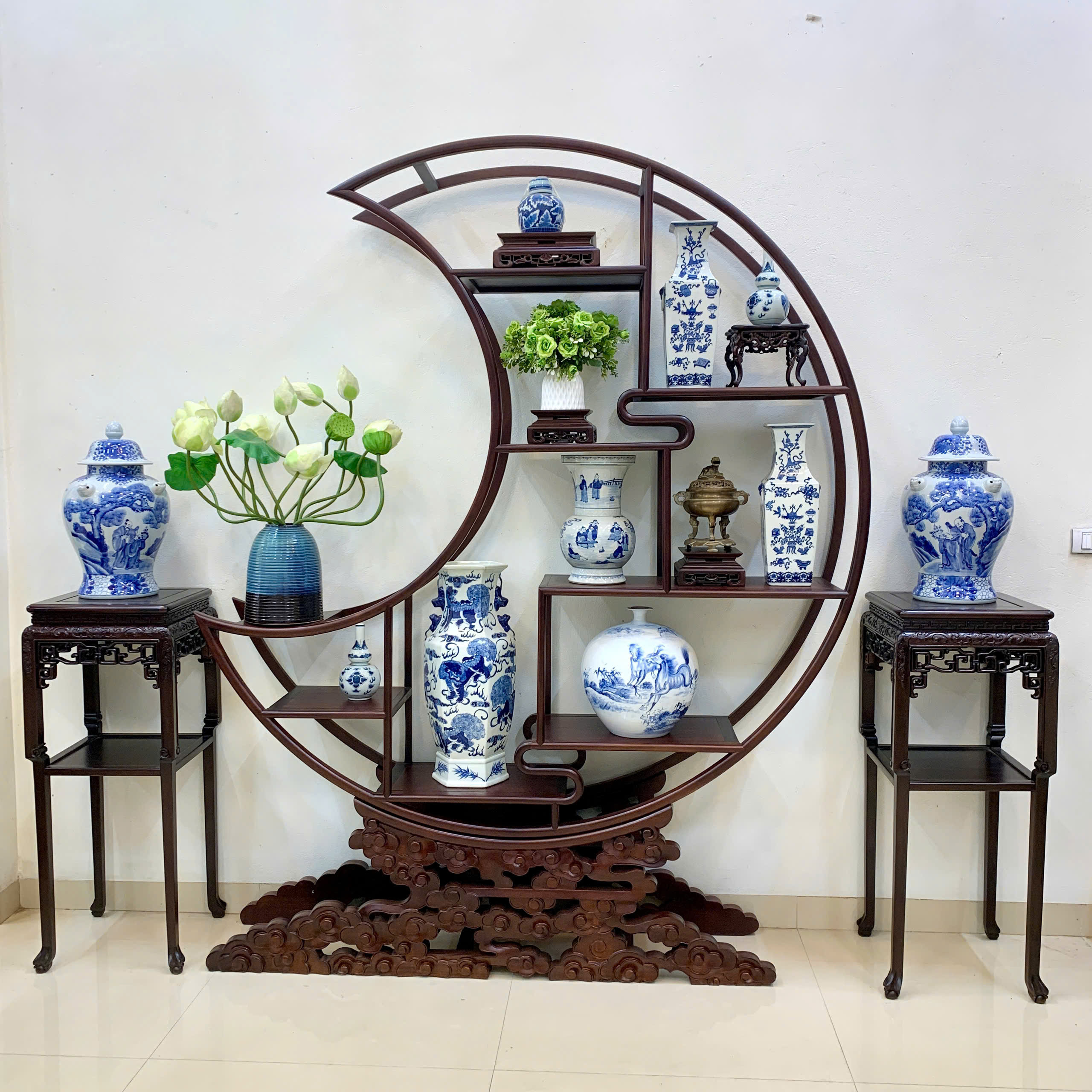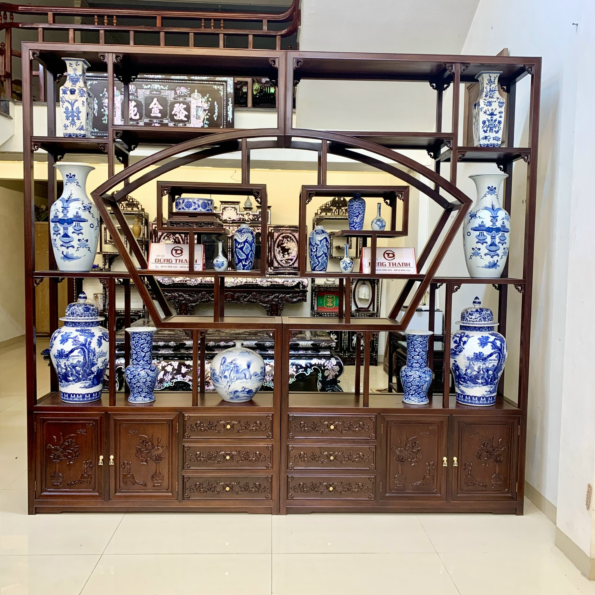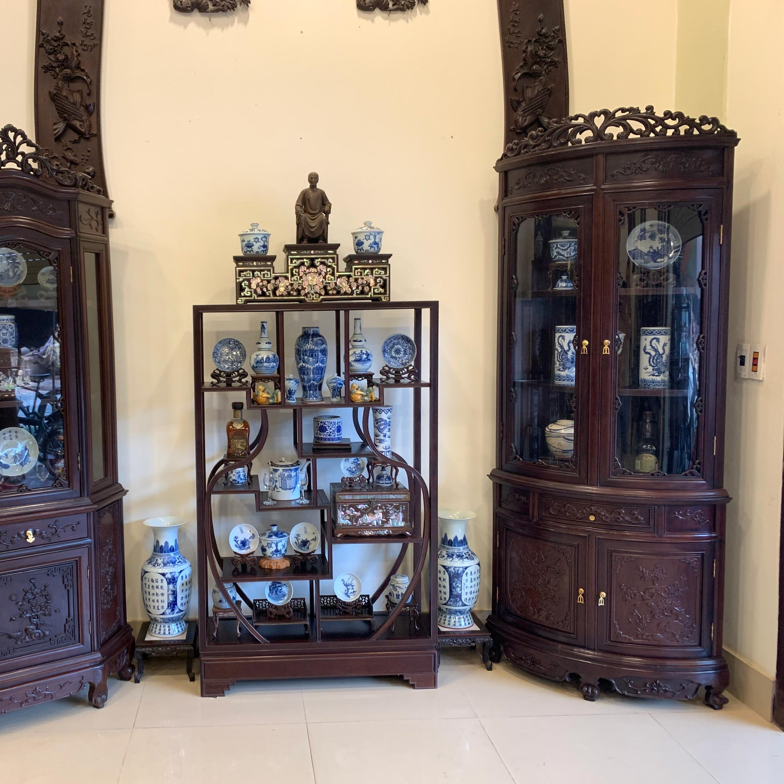 9. Tủ trang trí phòng khách gỗ gụ Nam Định – Kệ bày đồ Trăng Khuyết