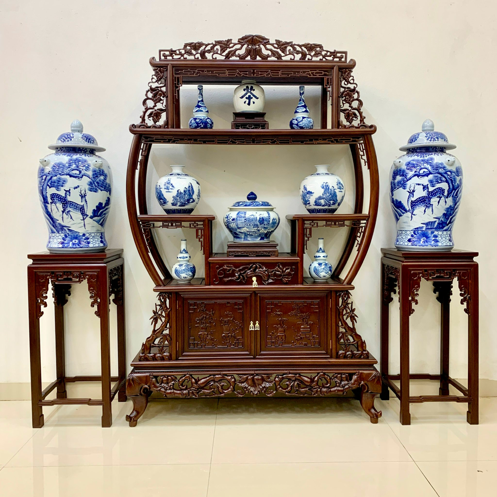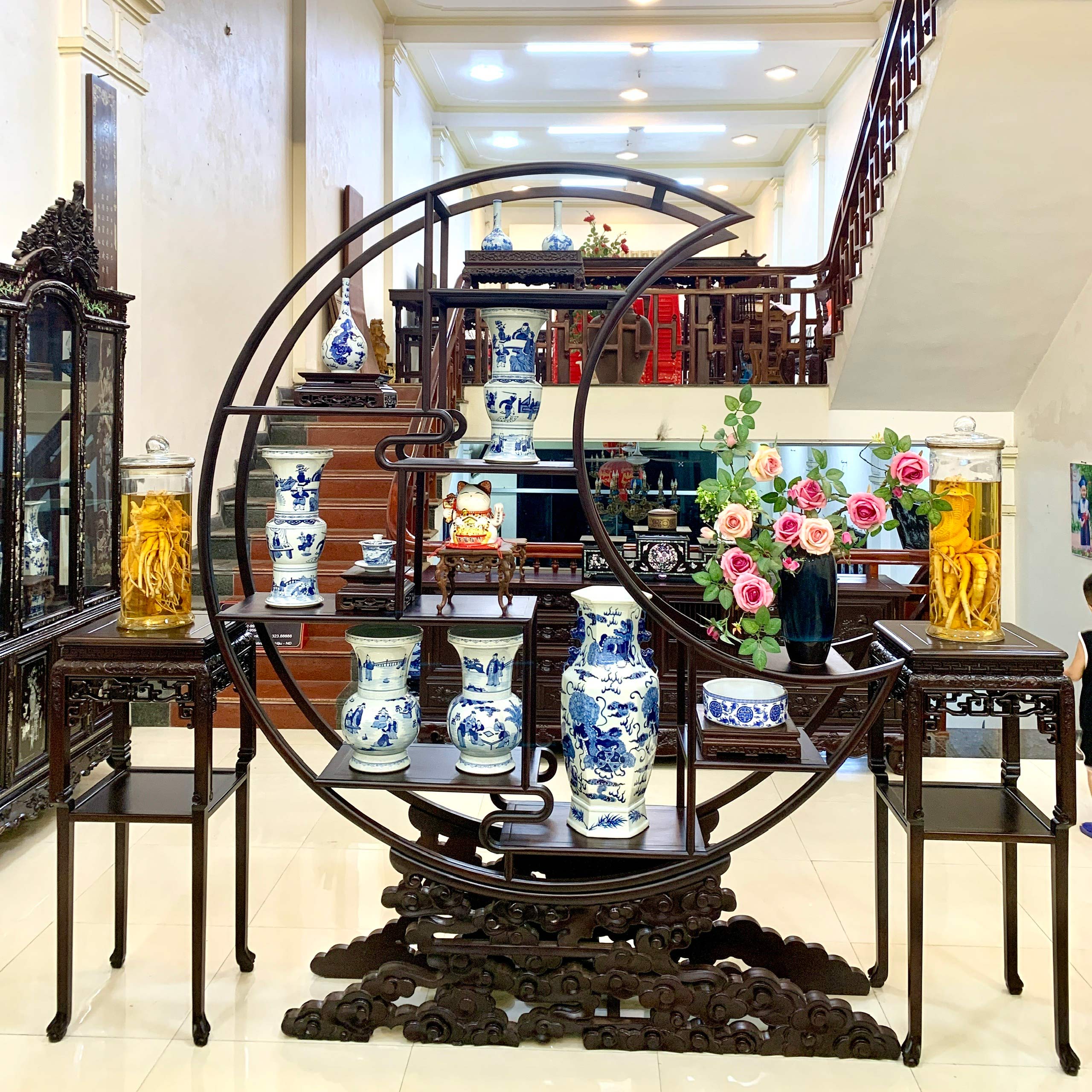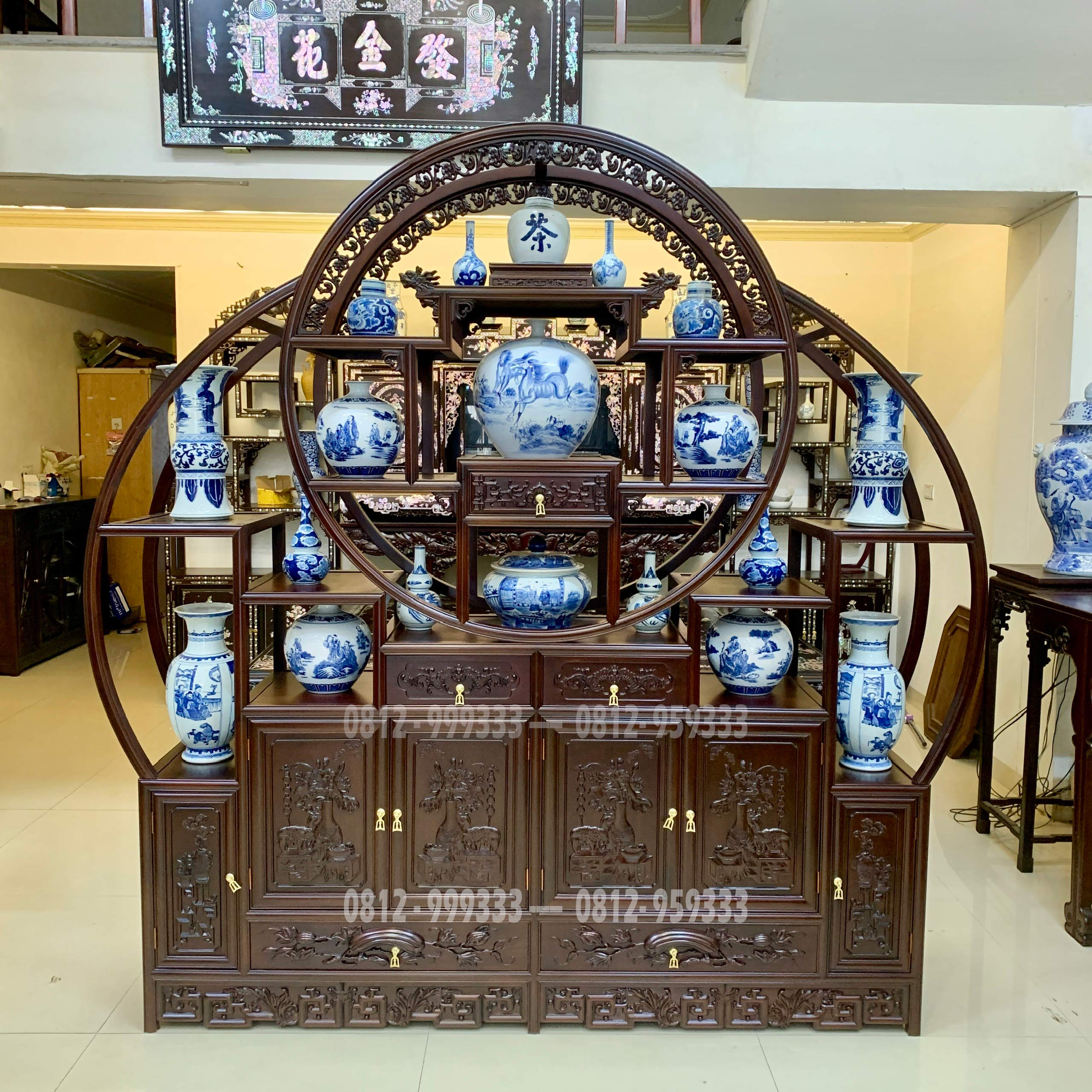9. Tủ trang trí phòng khách gỗ gụ Nam Định – Kệ bày đồ Trăng Khuyết