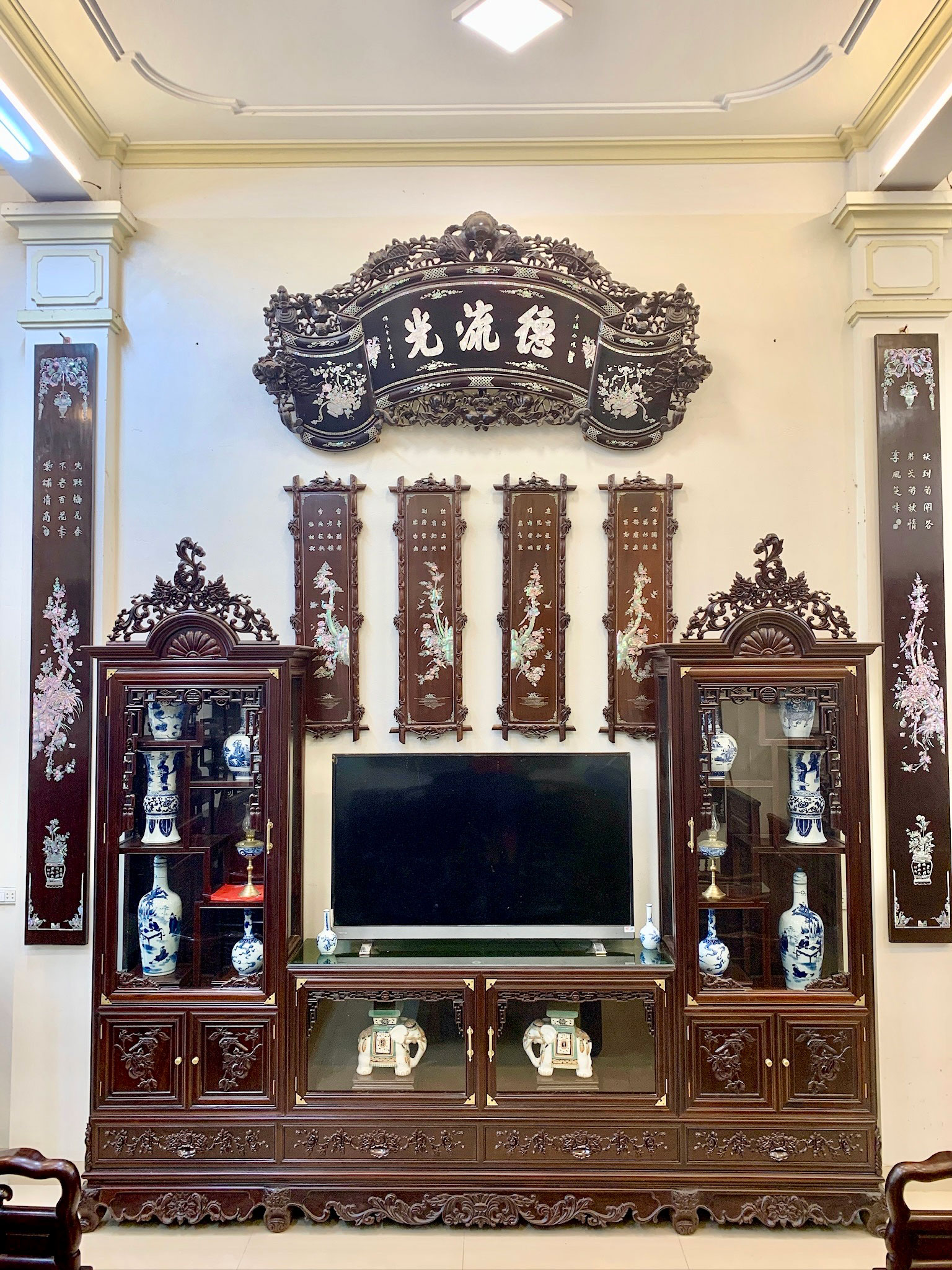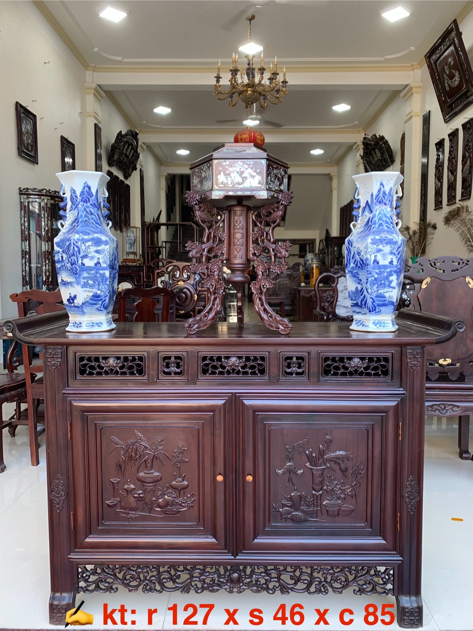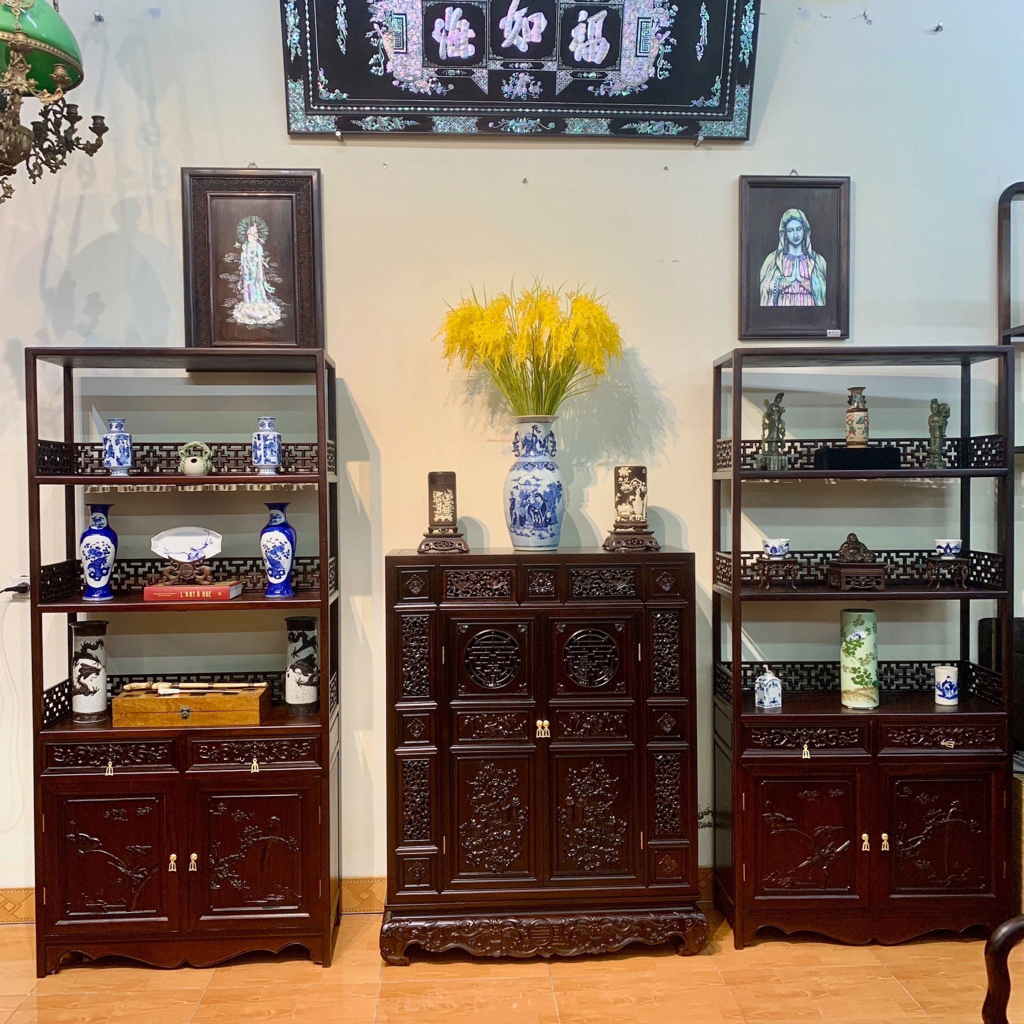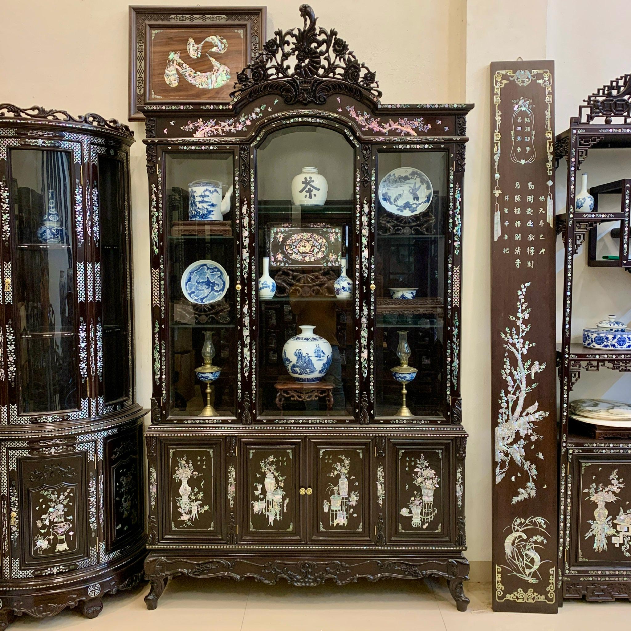 Tủ bày đồ 3 buồng kết hợp khảm ốc xà cừ tinh xảo tạo điểm nhấn ấn tượng sang trọng cho không gian phòng khách, phòng ăn ....