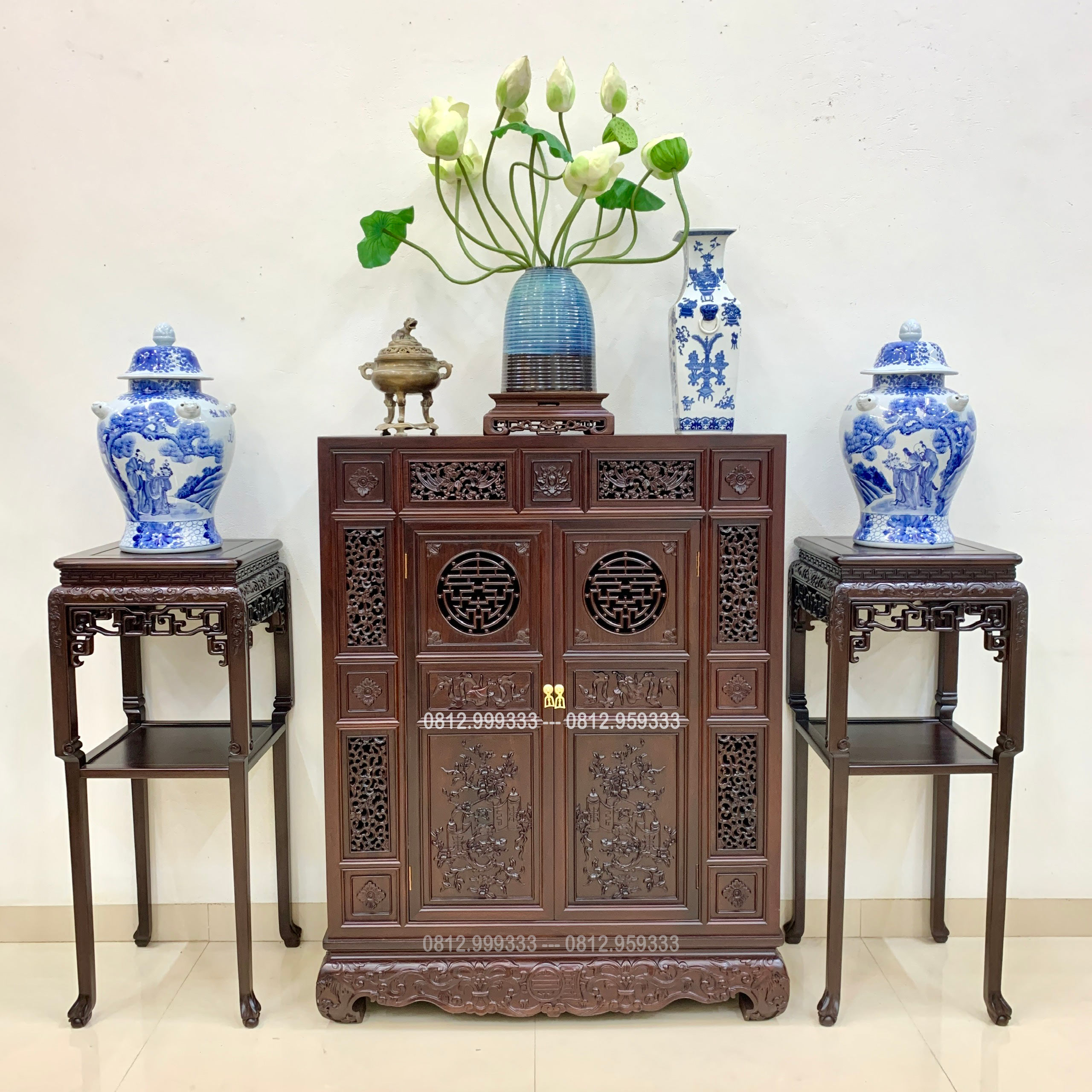1. Tủ trang trí gỗ gụ kết hợp kệ tivi – chạm khắc thủ công tinh xảo