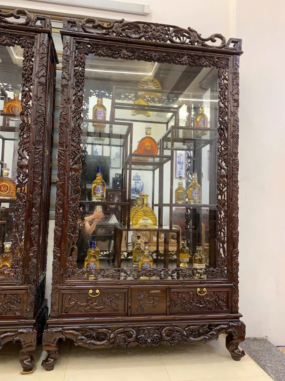 Tủ bày rượu trúc nho, phần khung được đục họa tiết trúc nho đan xen tạo điểm nhấn cho chiếc tủ thêm độ tinh xảo. Kích thước: rộng 127 x sâu 43 x cao 2m23